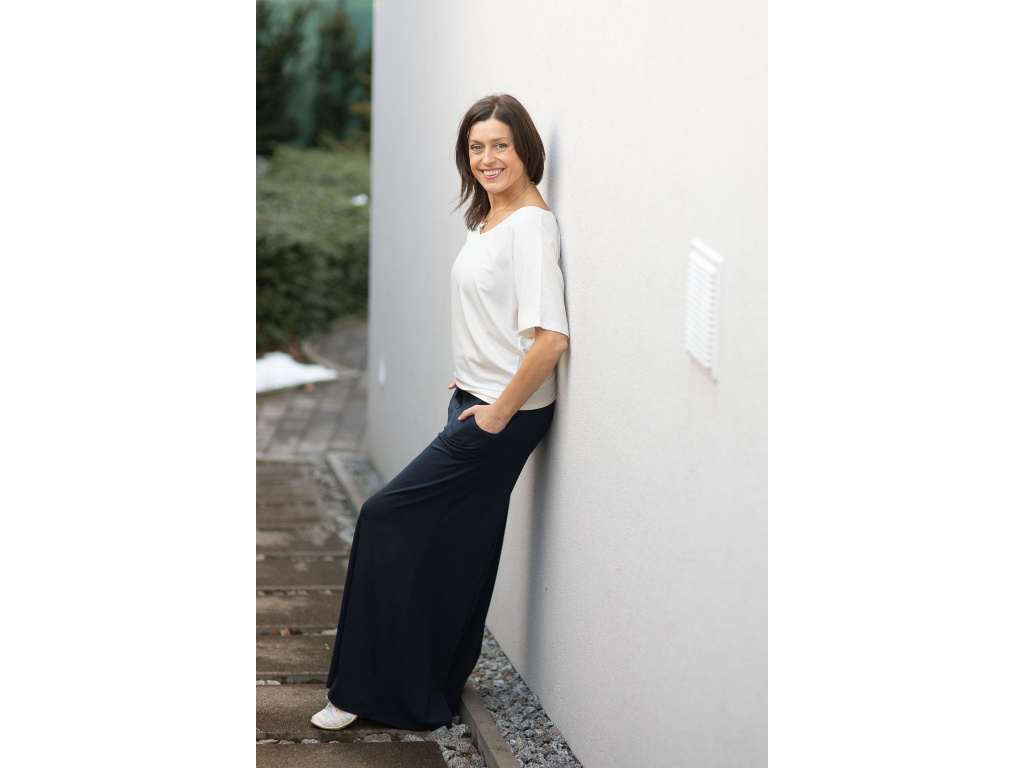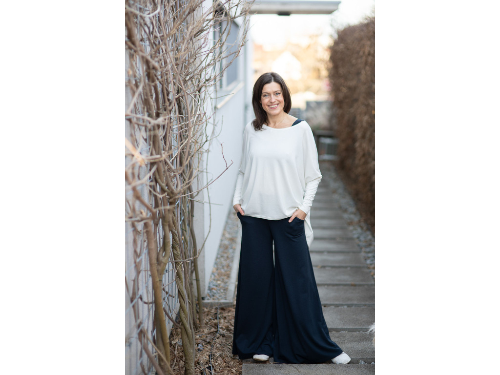 NÁŠ TYP: Vytvořte si postupně krásný, originální komplet který se vám bude jednoduše kombinovat, vrstvit a ve kterém se bude cítit krásně a elegantně po celý den. Kalhoty jsou v pase šité do široké manžety, která je v přední části průžná a do zadní části je všita guma pro větší pohodlí. V pase jsou poutka pro možnost vložení vlastního pásku nebo barevného šátku. Kalhoty Adina mají vyšší pas než kalhoty Inanna.