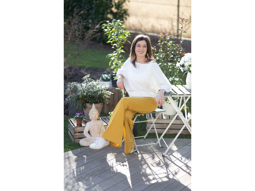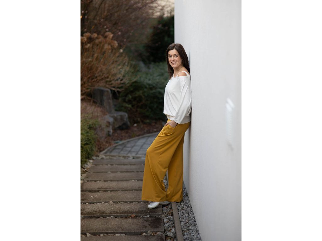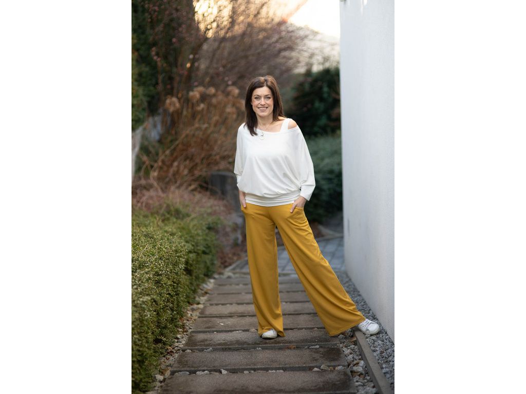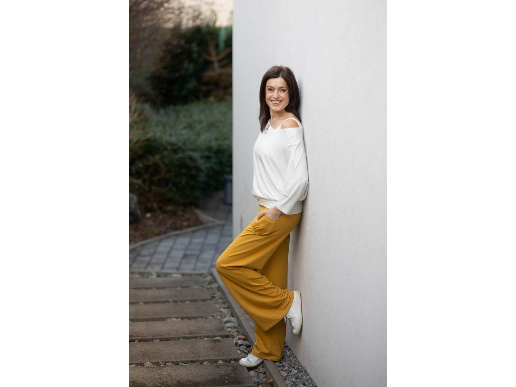 NÁŠ TYP: Vytvořte si postupně krásný, originální komplet který se vám bude jednoduše kombinovat, vrstvit a ve kterém se bude cítit krásně a elegantně po celý den. Kalhoty jsou v pase šité do široké manžety, která je v přední části průžná a do zadní části je všita guma pro větší pohodlí.