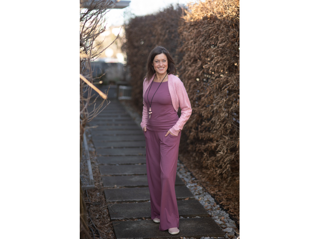 NÁŠ TYP: Vytvořte si postupně krásný, originální komplet který se vám bude jednoduše kombinovat, vrstvit a ve kterém se bude cítit krásně a elegantně po celý den. Kalhoty jsou v pase šité do široké manžety, která je v přední části průžná a do zadní části je všita guma pro větší pohodlí.