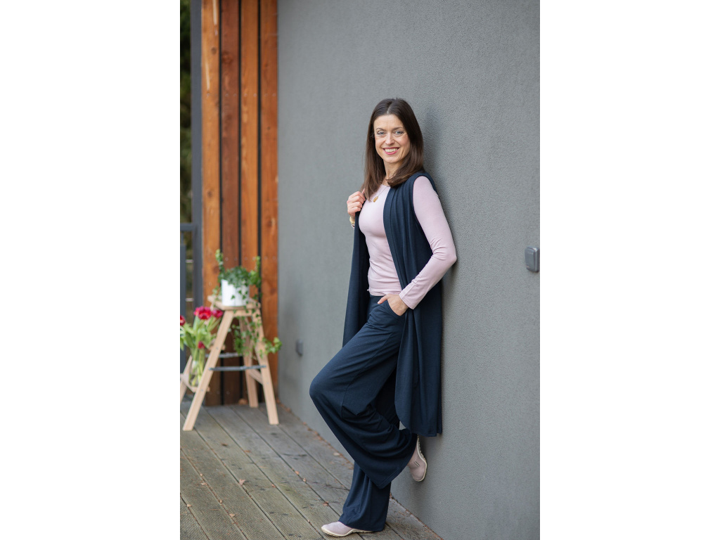 NÁŠ TYP: Vytvořte si postupně krásný, originální komplet který se vám bude jednoduše kombinovat, vrstvit a ve kterém se bude cítit krásně a elegantně po celý den. Kalhoty jsou v pase šité do široké manžety, která je v přední části průžná a do zadní části je všita guma pro větší pohodlí.