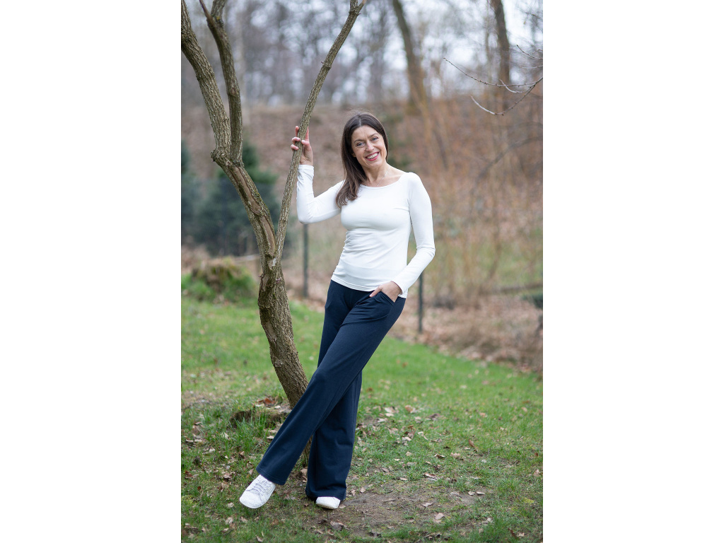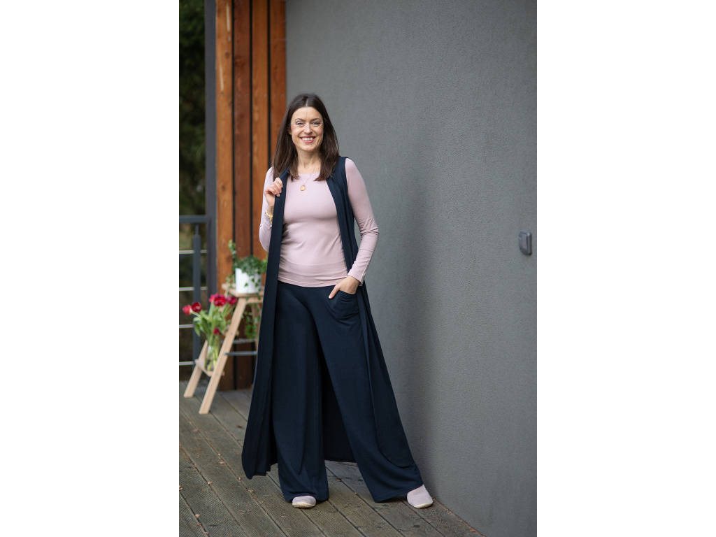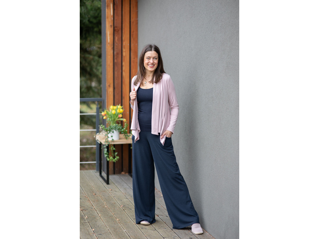 NÁŠ TYP: Vytvořte si postupně krásný, originální komplet který se vám bude jednoduše kombinovat, vrstvit a ve kterém se bude cítit krásně a elegantně po celý den. Kalhoty jsou v pase šité do široké manžety, která je v přední části průžná a do zadní části je všita guma pro větší pohodlí.