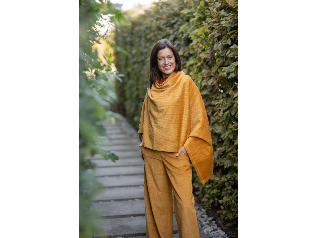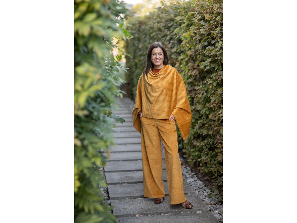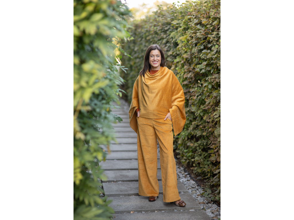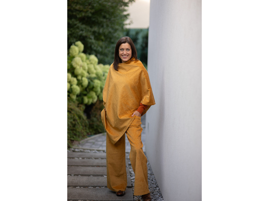 Můžete si ho obléci ke kalhotám všech délek a střihů. Za mě pončo Freya nejlépe vynikne u kalhot s širokou nohavicí, jako mají kalhoty Inanna. Moc pěkně se hodí i ke kalhotám s úzkými nohavicemi (skinny džíny) nebo legínám s kozačkami.
