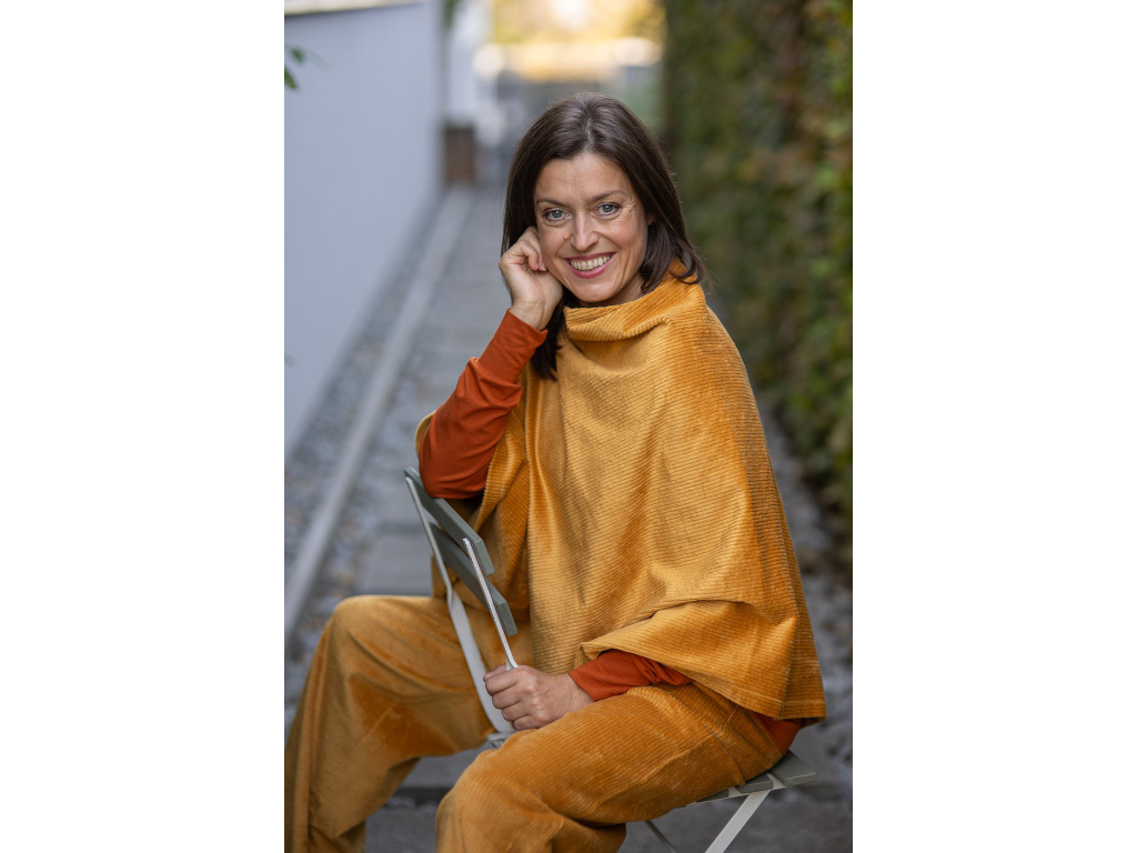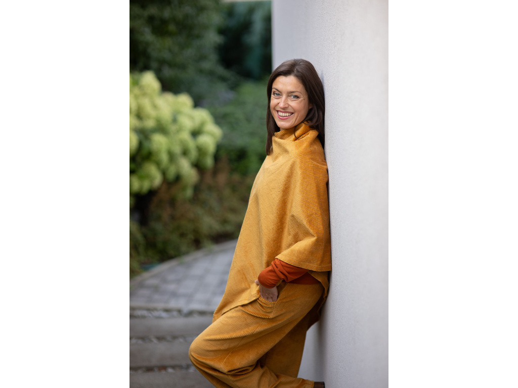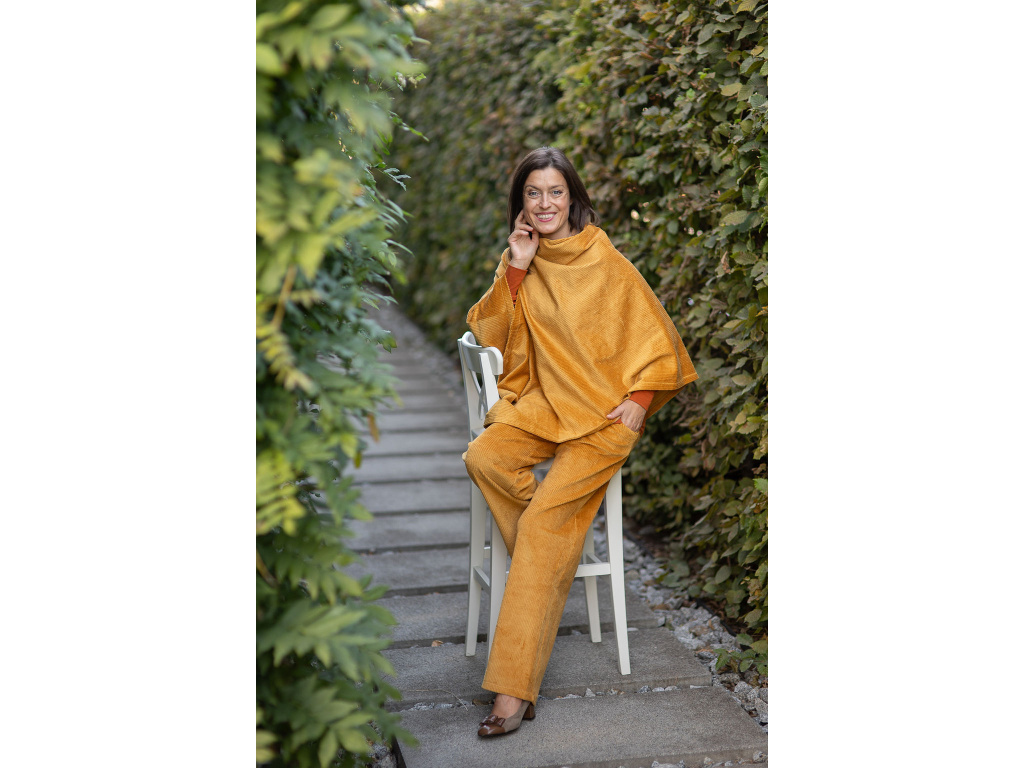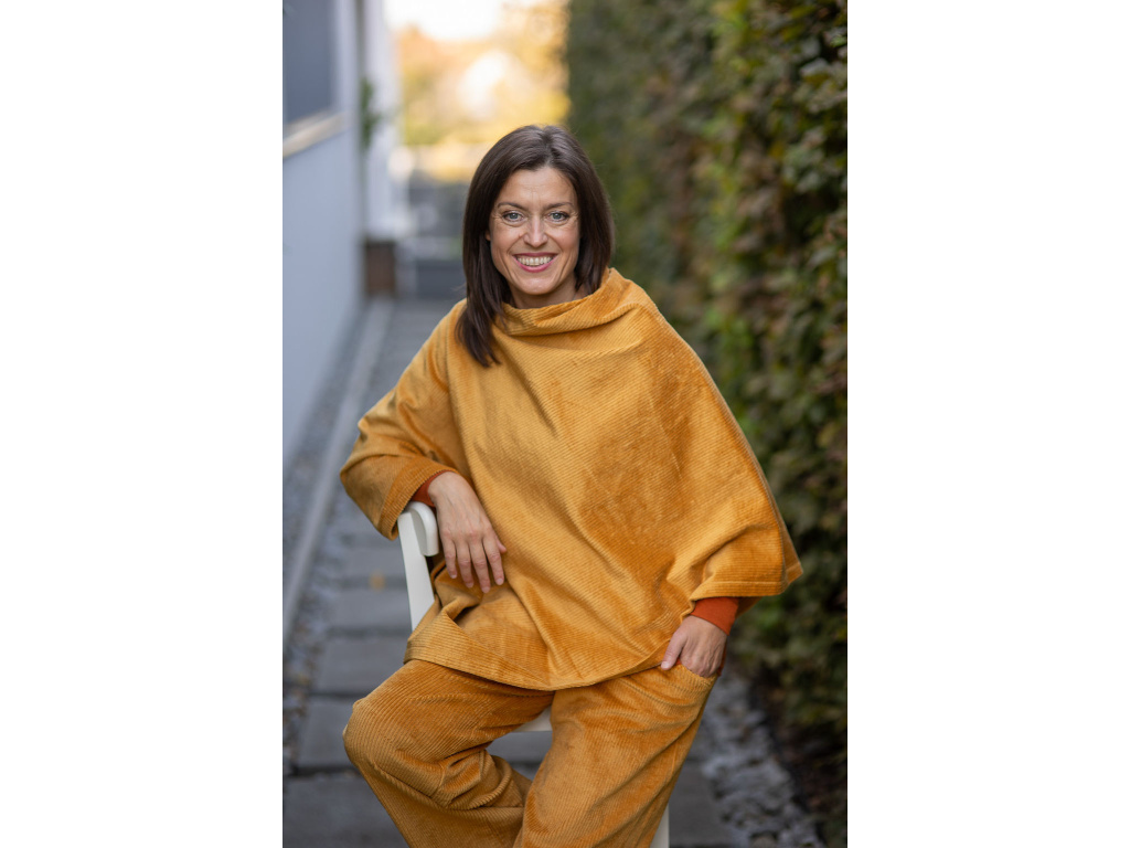 Můžete si ho obléci ke kalhotám všech délek a střihů. Za mě pončo Freya nejlépe vynikne u kalhot s širokou nohavicí, jako mají kalhoty Inanna. Moc pěkně se hodí i ke kalhotám s úzkými nohavicemi (skinny džíny) nebo legínám s kozačkami.