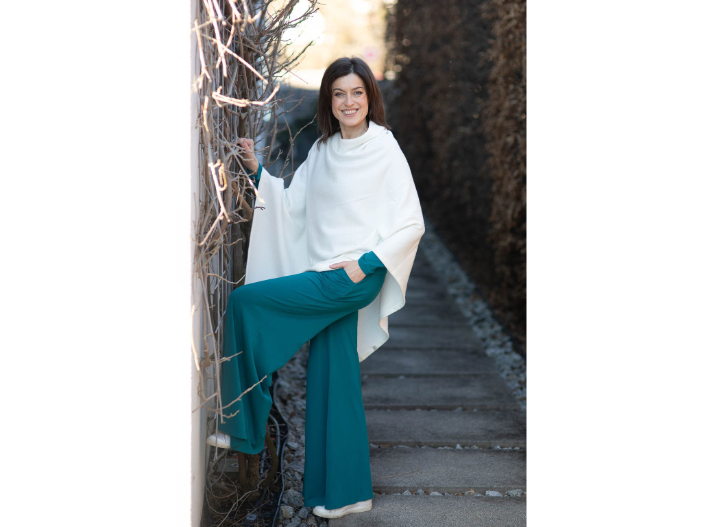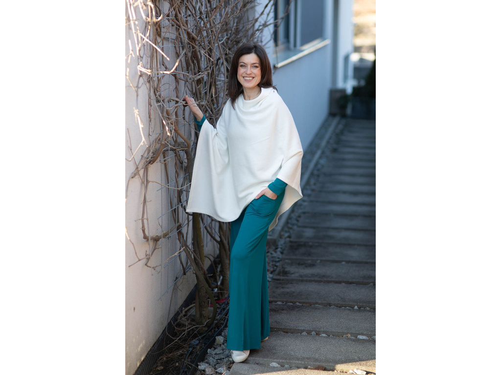 Můžete si ho obléci ke kalhotám všech délek a střihů nebo dlohé sukni Iris. Za mě pončo Freya nejlépe vynikne u kalhot s širokou nohavicí, jako mají kalhoty Inanna, které jsou ze stejné svetroviny jako pončo, nebo kalhoty z bambusu. Moc pěkně se hodí i ke kalhotám s úzkými nohavicemi (skinny džíny) nebo legínám s kozačkami.