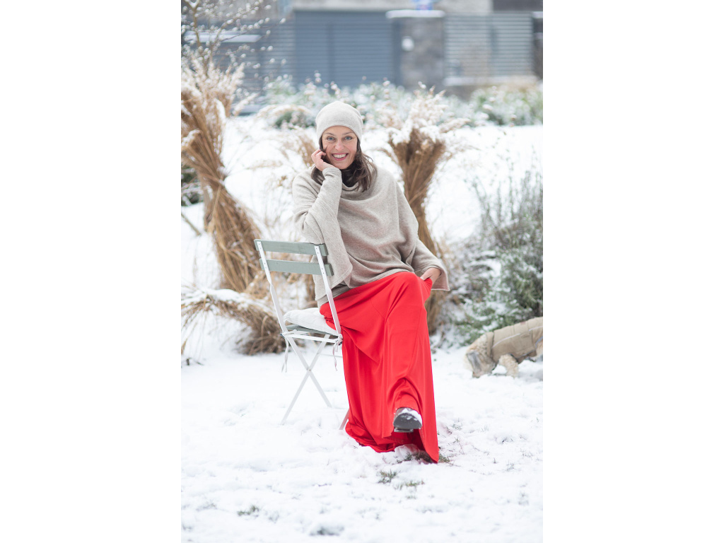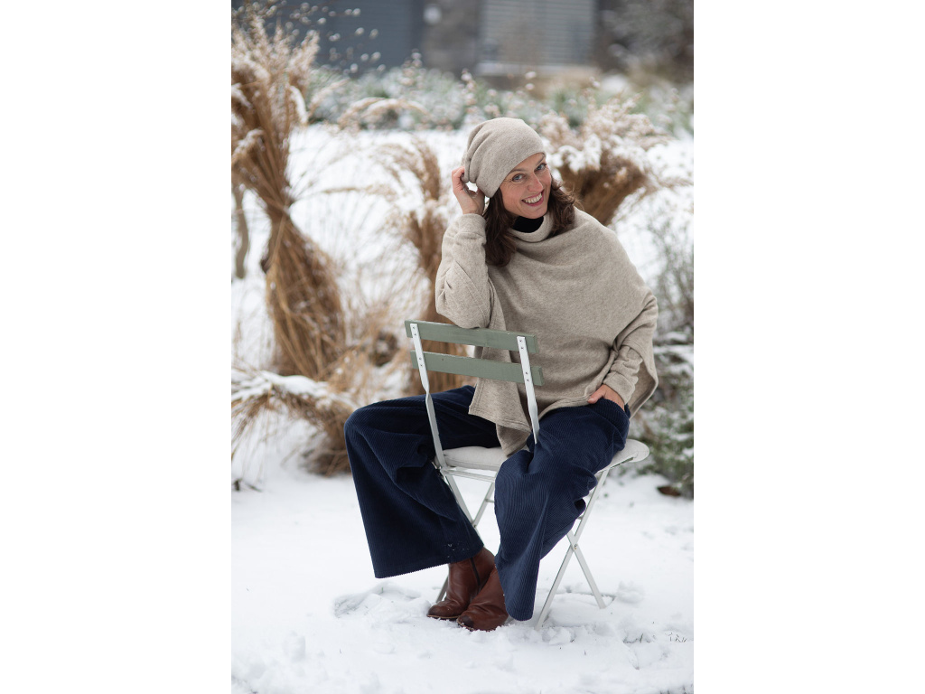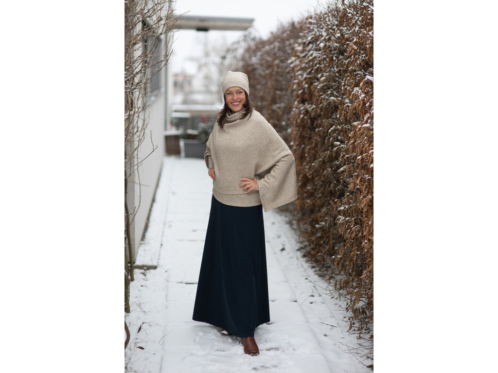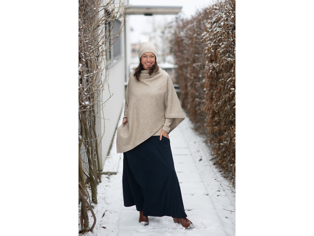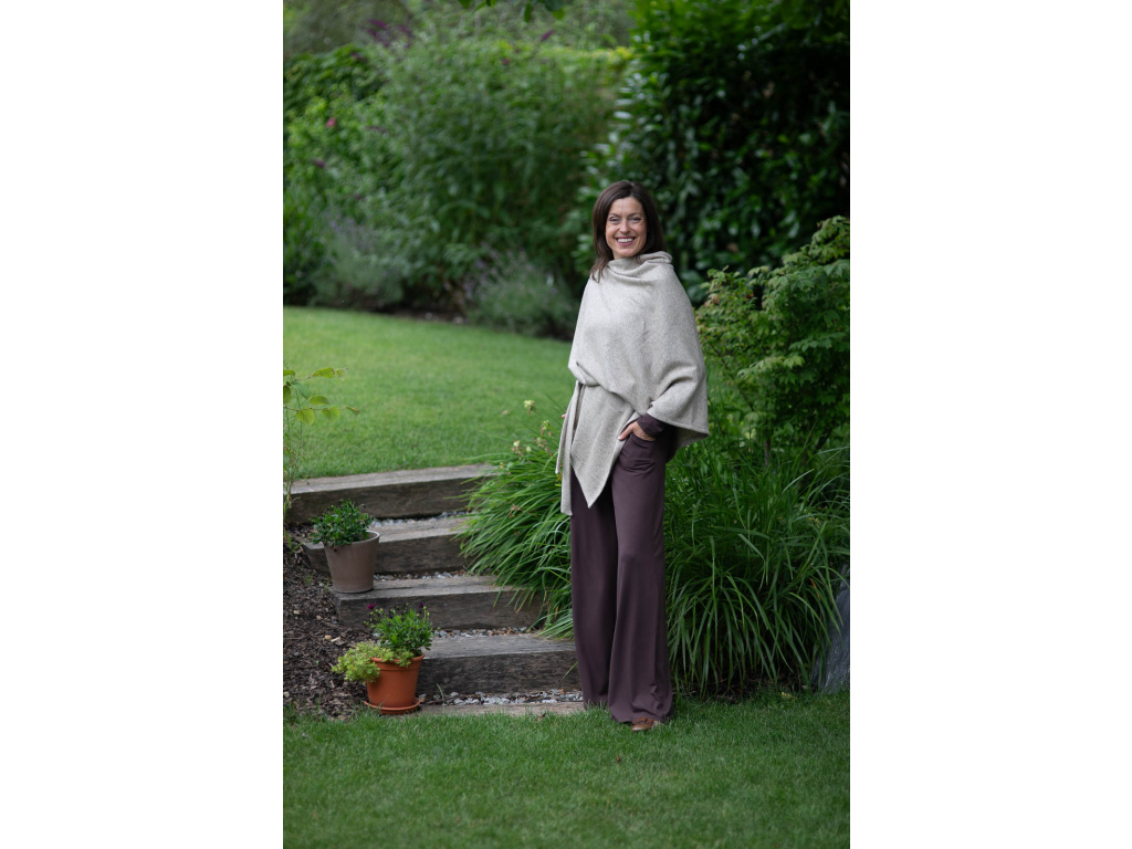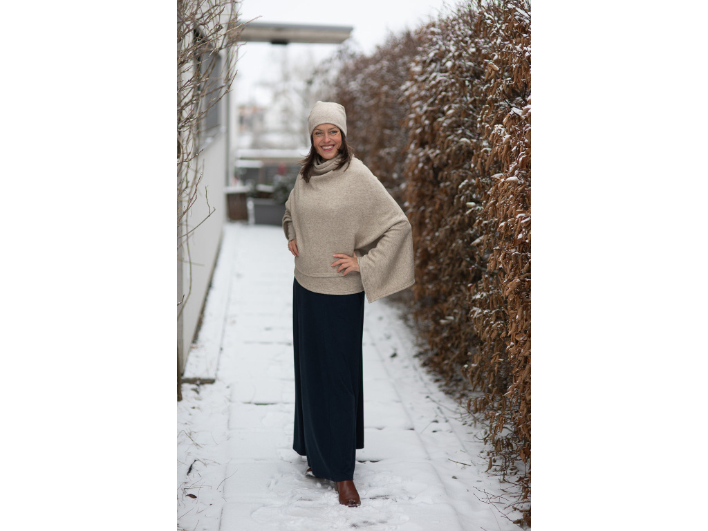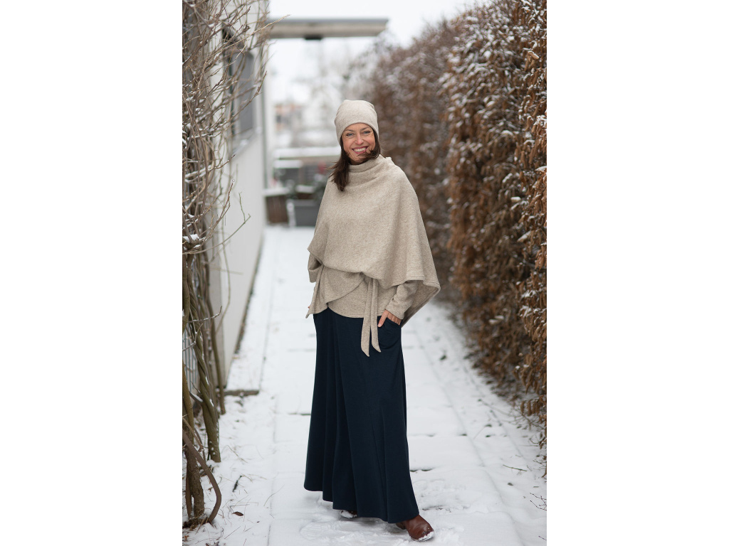 Můžete si ho obléci ke kalhotám všech délek a střihů nebo dlohé sukni Iris. Za mě pončo Freya nejlépe vynikne u kalhot s širokou nohavicí, jako mají kalhoty Inanna, které jsou ze stejné svetroviny jako pončo, nebo kalhoty z bambusu. Moc pěkně se hodí i ke kalhotám s úzkými nohavicemi (skinny džíny) nebo legínám s kozačkami.