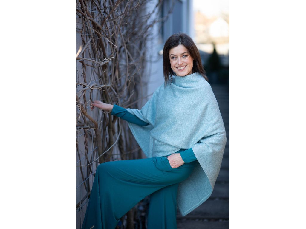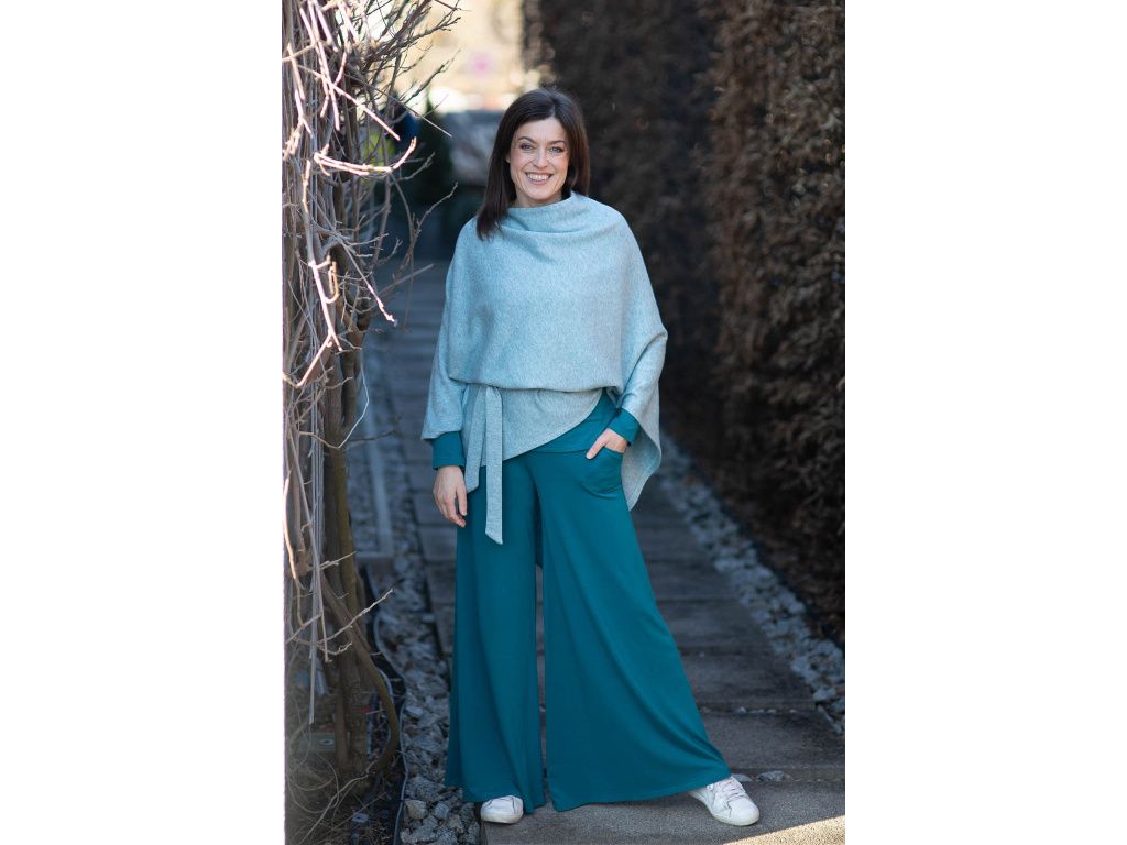 Pončo Freya má tu výhodu, že když ho vhodně zkombinujete, můžete ho nosit téměř celoročně. Stejně tak si ho můžete obléci ke kalhotám všech délek a střihů. Za mě pončo Freya nejlépe vynikne u kalhot s širokou nohavicí, jako mají kalhoty Inanna, které jsou ze stejné svetroviny jako pončo, nebo kalhoty z bambusu. Moc pěkně se hodí i ke kalhotám s úzkými nohavicemi Hestia nebo legínám s kozačkami.