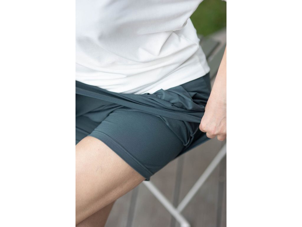 Sukně Eset je ušita z velmi příjemného, antibakteriálního bambusu ve směsi s elastanem. V pase nemá gumu, takže ji na těle téměř necítíte. Výhodou jsou všité kraťasy pro sport a volnočasové aktivity.