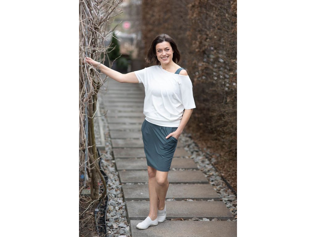 Sukně Gaia je ušitá z velmi příjemného materiálu a v pase nemá gumu, ale manžetu jako naše sukně Iris, takže ji na těle téměř neucítíte. Má elegantní sklady a kapsy v "balónovém" střihu.