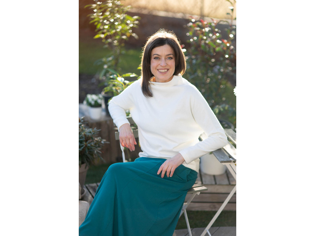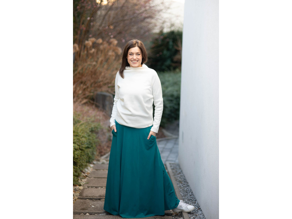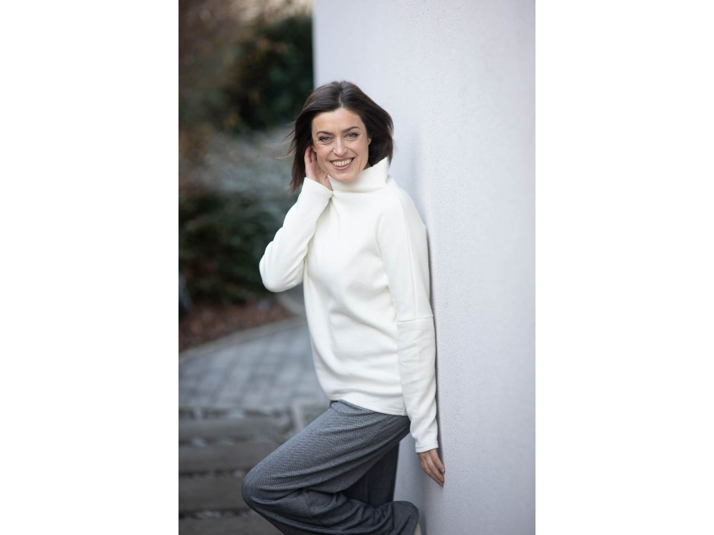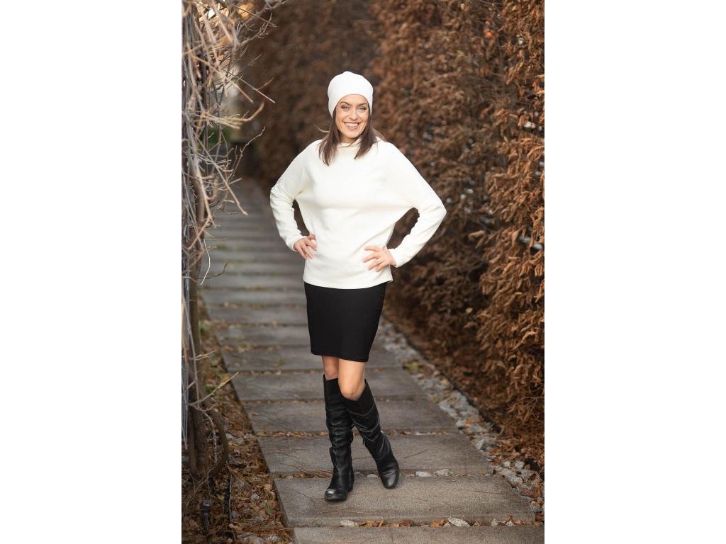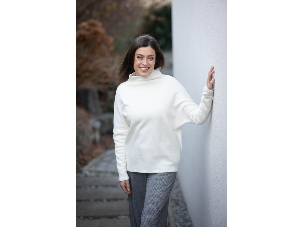 Svetr má stojáček, lehce netopýří rukávy, ve vrchní části těla a okolo bříška je volnější a v oblasti boků se zužuje. Takže všechno, co má zůstat skryto, zůstane skryto.