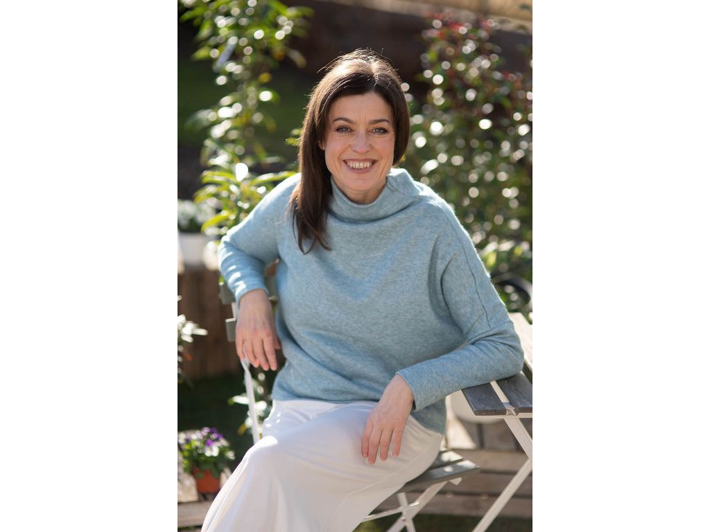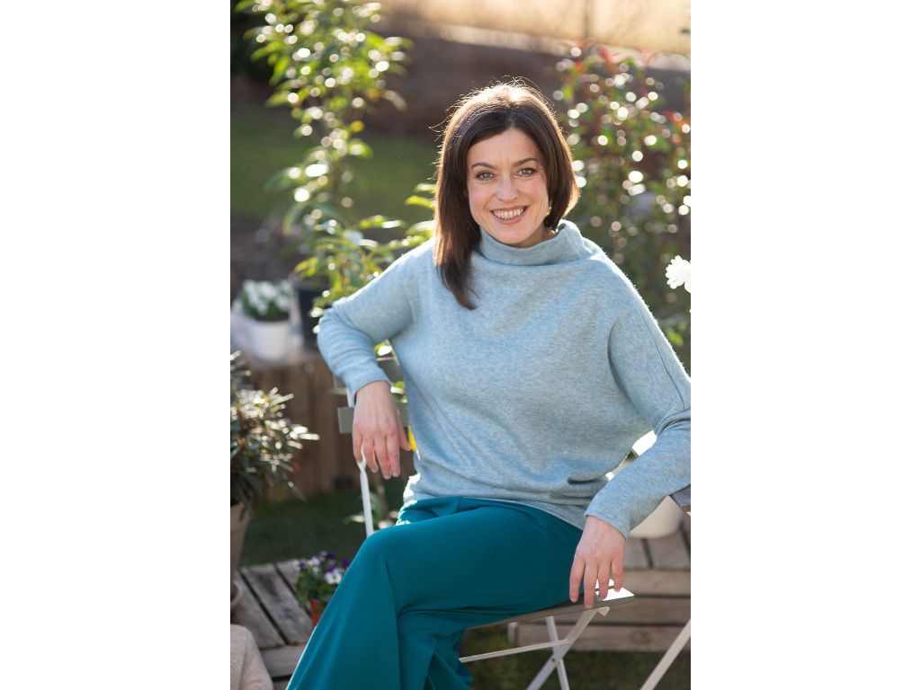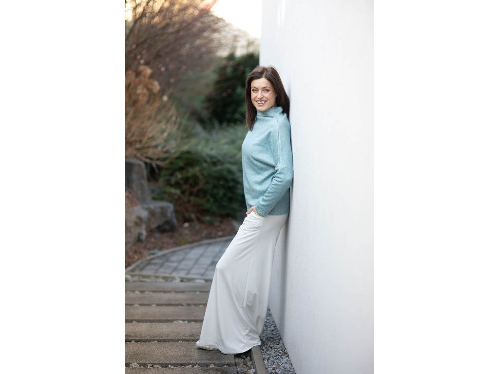 Svetr má stojáček, lehce netopýří rukávy, ve vrchní části těla a okolo bříška je volnější a v oblasti boků se zužuje. Takže všechno, co má zůstat skryto, zůstane skryto.