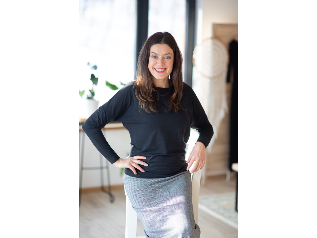 Jeho spodní lem končí pod kyčelní kostí, triko ve spodní části lehce kopíruje tělo a těsně nad bříškem se rozšiřuje. Má lodičkový výstřih a díky rozšířenému, lehce netopýřímu rukávu je příjemně vzdušné.
