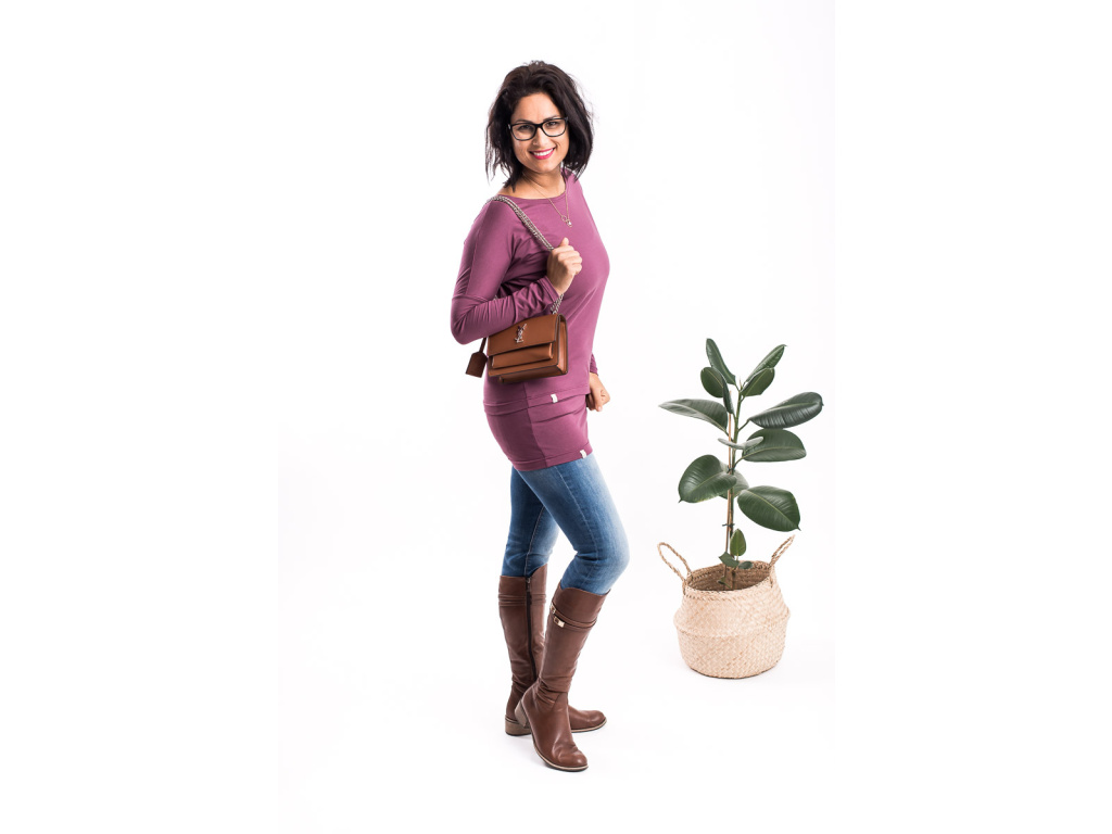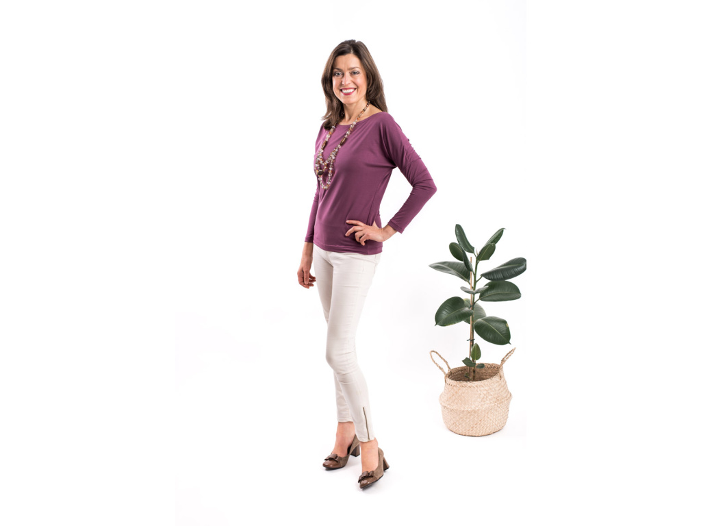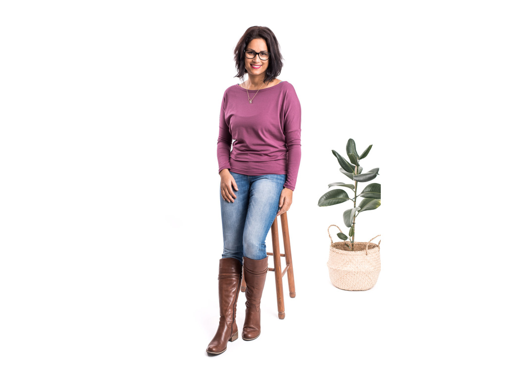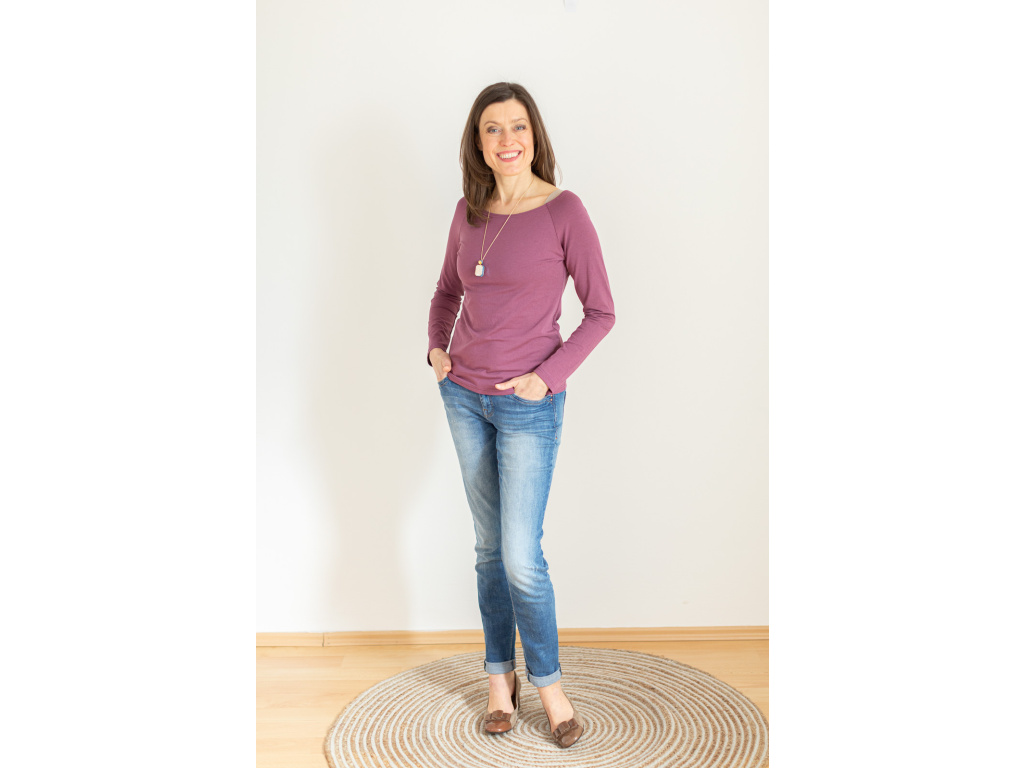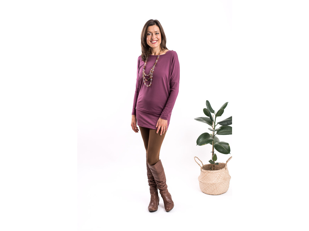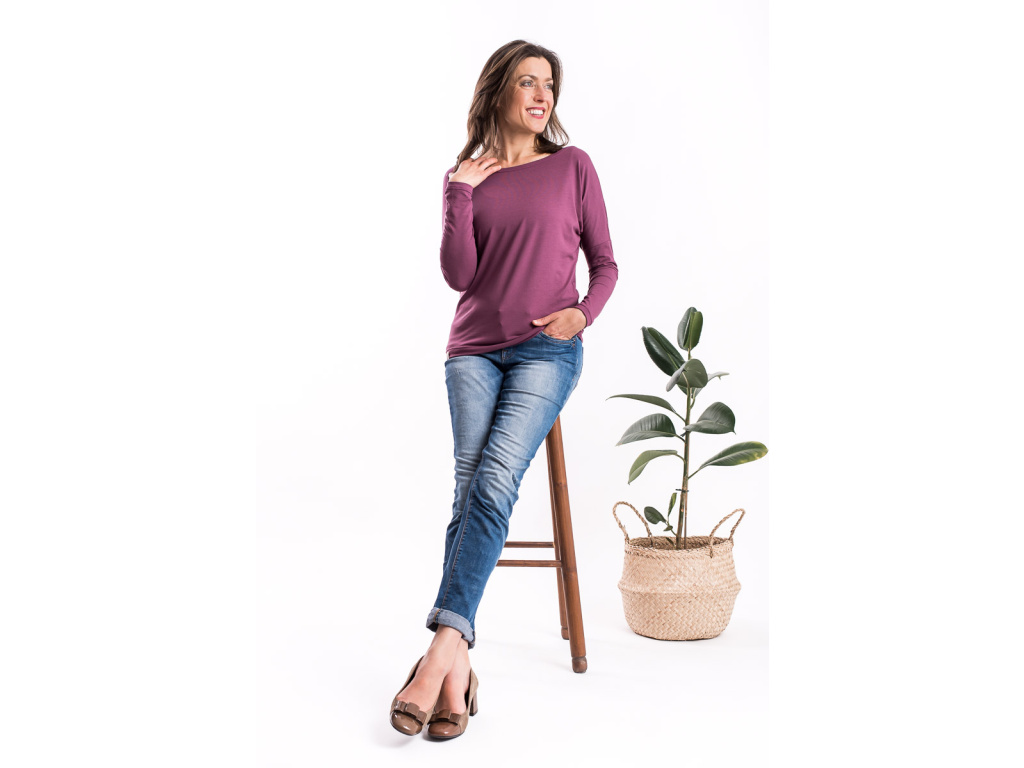 Jeho spodní lem končí pod kyčelní kostí, triko ve spodní části lehce kopíruje tělo a těsně nad bříškem se rozšiřuje. Má lodičkový výstřih a díky rozšířenému, lehce netopýřímu rukávu je příjemně vzdušné.