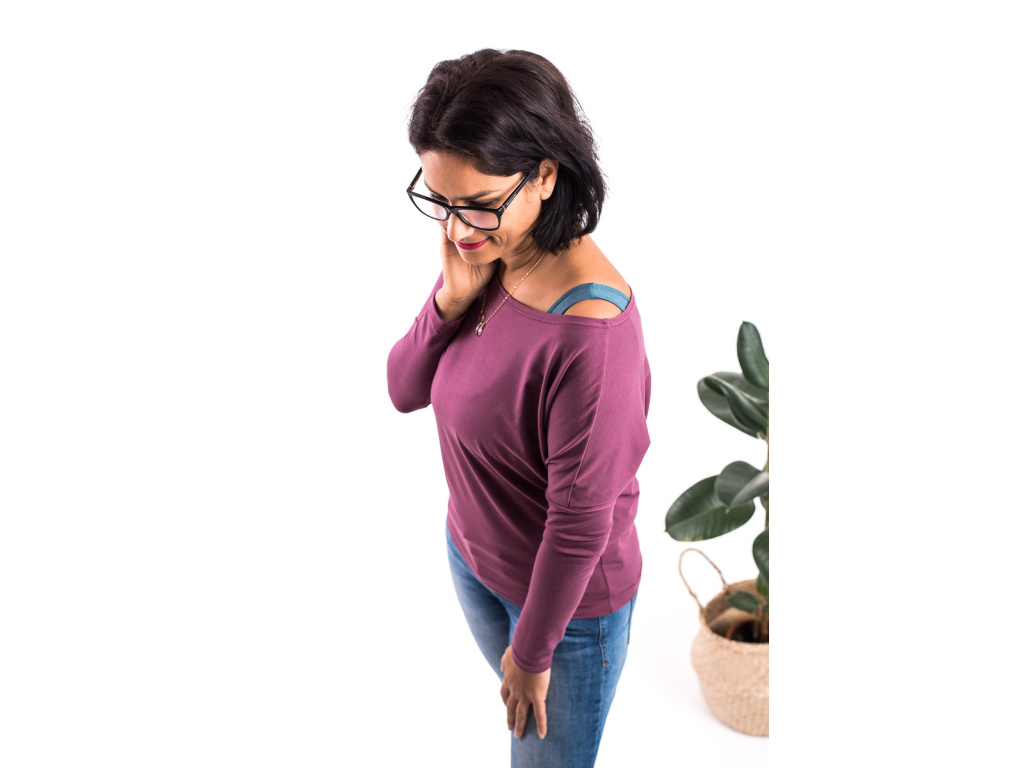 Jeho spodní lem končí pod kyčelní kostí, triko ve spodní části lehce kopíruje tělo a těsně nad bříškem se rozšiřuje. Má lodičkový výstřih a díky rozšířenému, lehce netopýřímu rukávu je příjemně vzdušné.