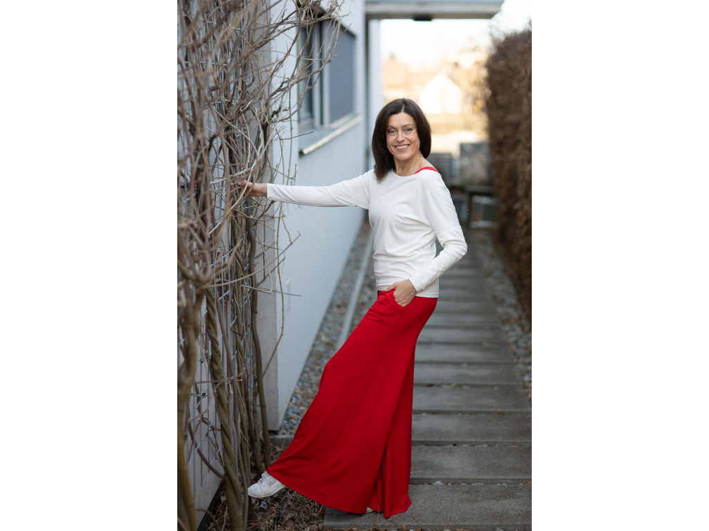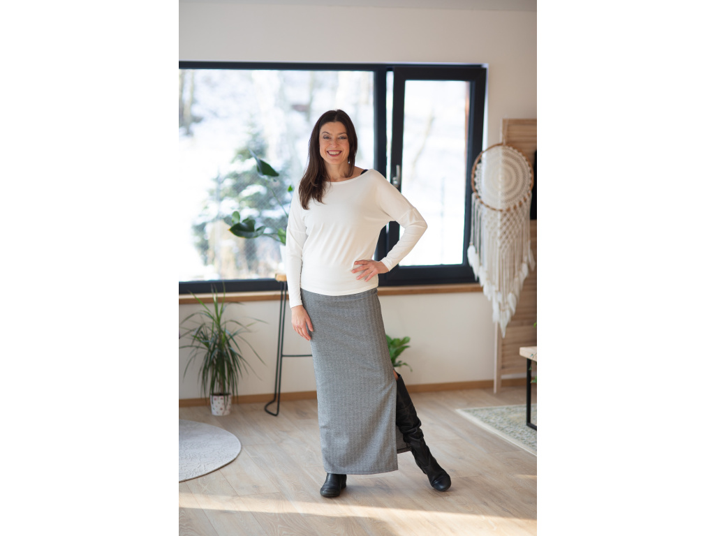 Hodit se vám bude k dlouhým i kratším sukním všech tvarů a vzorů a stejně tak ke kalhotám či kraťasům (snad jen k legínám bych ho nedoporučila – kvůli délce). Jeho spodní lem končí pod kyčelní kostí, triko ve spodní části lehce kopíruje tělo a těsně nad bříškem se rozšiřuje. Má lodičkový výstřih a díky rozšířenému, lehce netopýřímu rukávu je příjemně vzdušné.