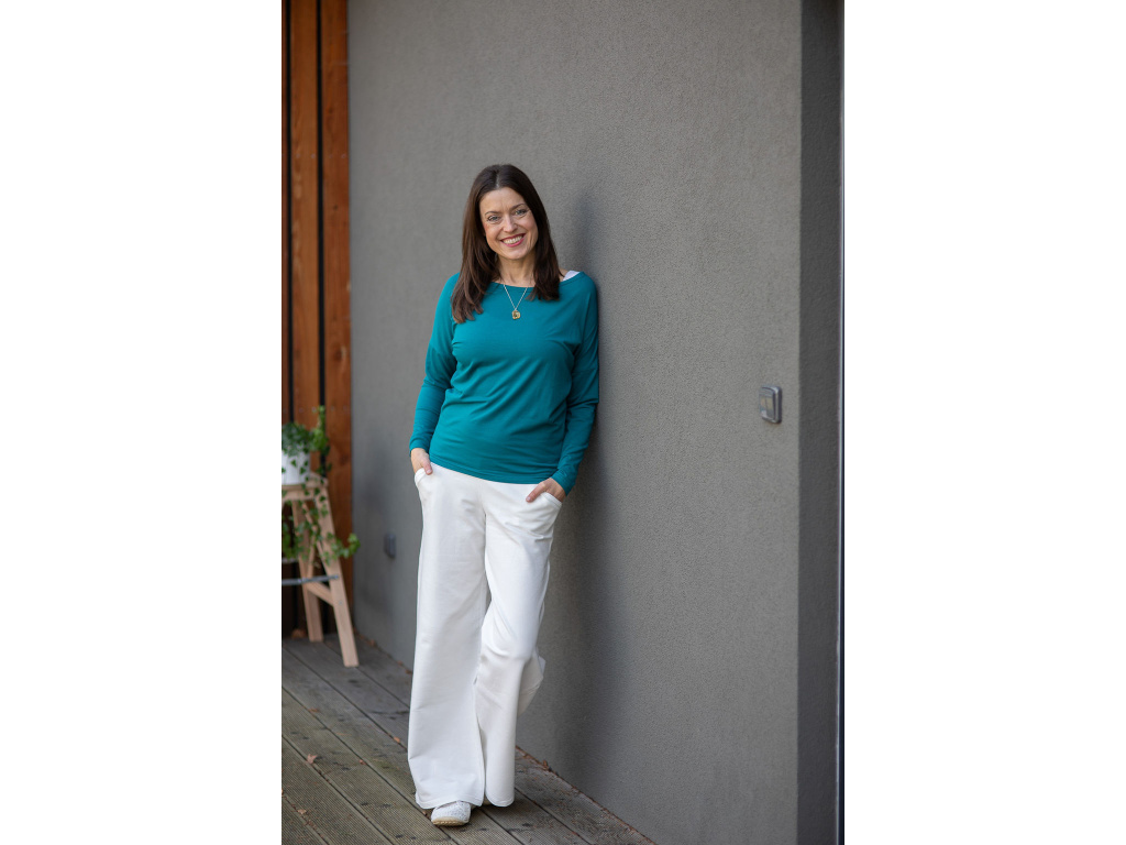 Hodit se vám bude k dlouhým i kratším sukním všech tvarů a vzorů a stejně tak ke kalhotám či kraťasům (snad jen k legínám bych ho nedoporučila – kvůli délce). Jeho spodní lem končí pod kyčelní kostí, triko ve spodní části lehce kopíruje tělo a těsně nad bříškem se rozšiřuje. Má lodičkový výstřih a díky rozšířenému, lehce netopýřímu rukávu je příjemně vzdušné.