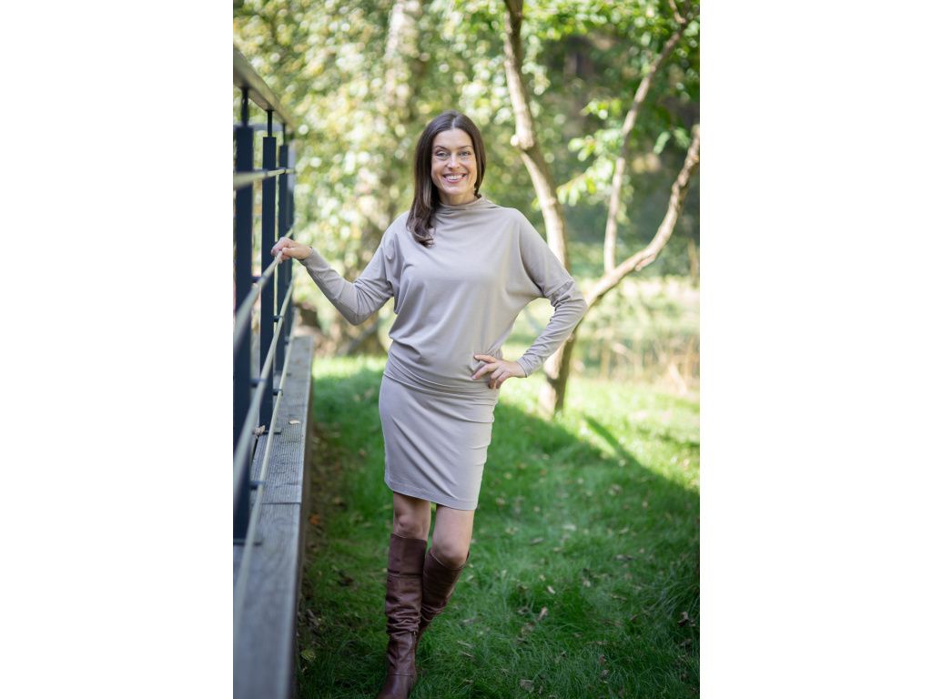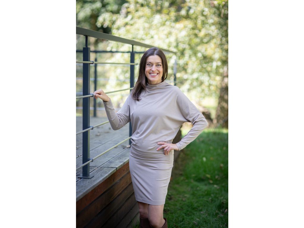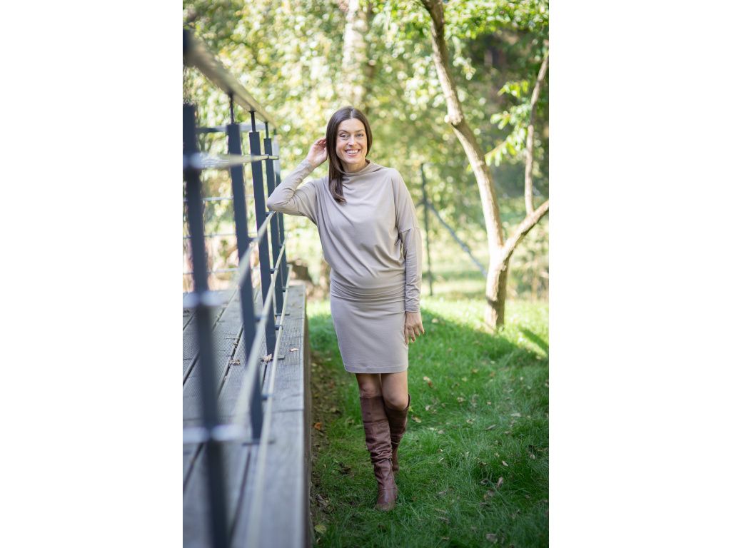 Jeho spodní lem končí pod kyčelní kostí, triko ve spodní části lehce kopíruje tělo a těsně nad bříškem se rozšiřuje. Má stojáček a díky rozšířenému, lehce netopýřímu rukávu je příjemně vzdušné.