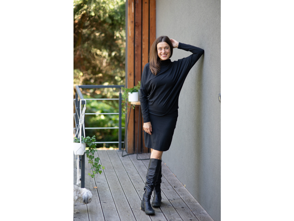Jeho spodní lem končí pod kyčelní kostí, triko ve spodní části lehce kopíruje tělo a těsně nad bříškem se rozšiřuje. Má stojáček a díky rozšířenému, lehce netopýřímu rukávu je příjemně vzdušné.