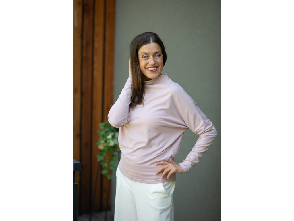 Jeho spodní lem končí pod kyčelní kostí, triko ve spodní části lehce kopíruje tělo a těsně nad bříškem se rozšiřuje. Má stojáček a díky rozšířenému, lehce netopýřímu rukávu je příjemně vzdušné.