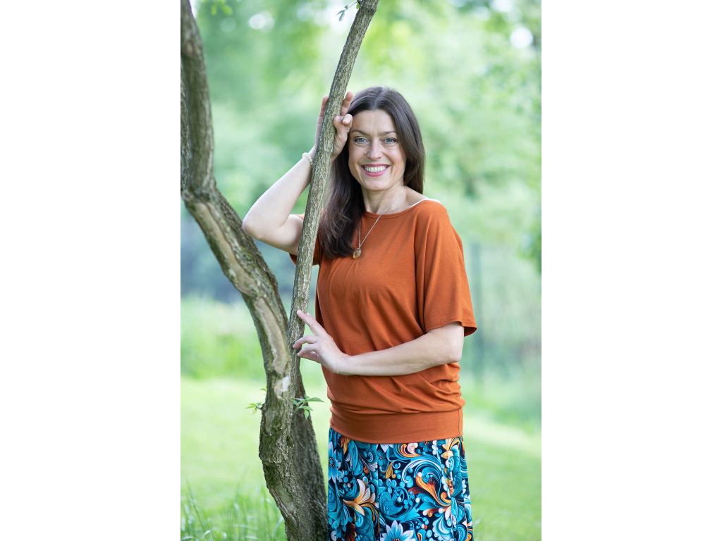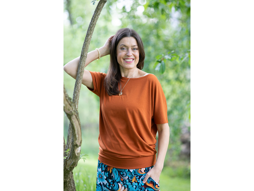Jeho výhodou je, že sluší opravdu všem typům postav a velikostí. A to díky skvěle promyšlenému střihu. Triko se hned od spodní manžety směrem nahoru rozšiřuje, a tak vás nebude nikde nic obepínat a všechno, co má zůstat skryto, skryté zůstane. Má lodičkový výstřih.