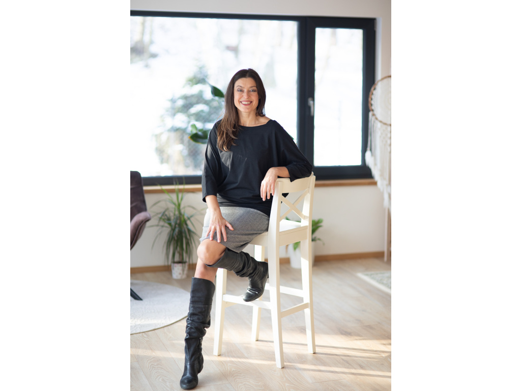 Jeho další výhodou je, že sluší opravdu všem typům postav a velikostí. A to díky skvěle promyšlenému střihu. Triko se hned od spodní manžety směrem nahoru rozšiřuje, a tak vás nebude nikde nic obepínat a všechno, co má zůstat skryto, skryté zůstane. Má lodičkový výstřih a krásné netopýří rukávy.